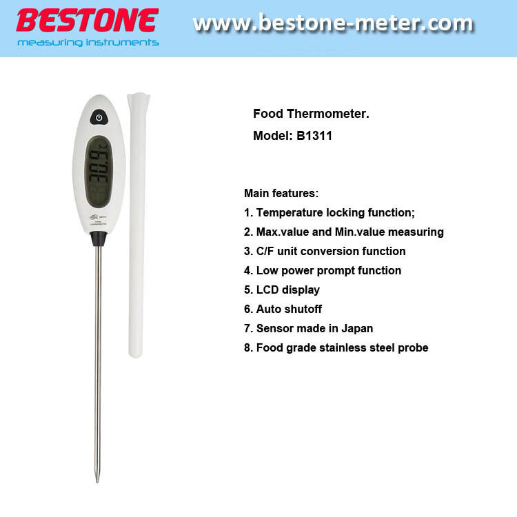 This product is mainly used for measuring the food temperature pen type structure food-level stainless steel probe width of measuring scope. The probe-type food thermometer may be used for measuring the cooking temperature and grilling temperature being applicable for such various fields as refrigeration heating food processing and rubber and plastic processing.