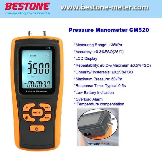 | Measurement range: ±350kPa Accuracy: ±0.3%FSO(25ºC) Repeatability: ± 0.2% (maximum +/-0.5% FSO) Maximum pressure: 150kPa Linearity/hysteresis: ± 0.29% FSO Response: typical 0.5 s Low battery indication USB communication Overload indication: Err1 Overload indication: Err2 Operating temperature: 0 ~ 50 ºC Storage temperature: -10 ~ 60 ºC Power supply: 1.5V AAA battery * 4 Standard Quantity per Box: 40 pieces. Standard carton size: 45.5*45.3*41.2cm Standard carton gross weight: 19.7KG |
