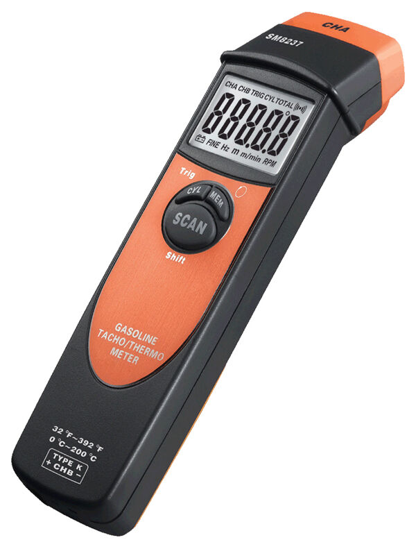 Inductive type measure the engine speed by noncontact Measuring the temperature cooling water in engine by contact Testing the rotate speed of multi-cylinder in same time, or testing one of cylinder rotate speed Testing the rotate speed used to 2 stokes and 4 strokes Can set the cylinder in 2, 3, 4, 5, 6, 8, 12 or set the impulse of each rotation Memory the maximum value, minimum value and last value Can record 300 testing data Low power symbol automatic indicating white back light ° C and ° F Temperature switch function.