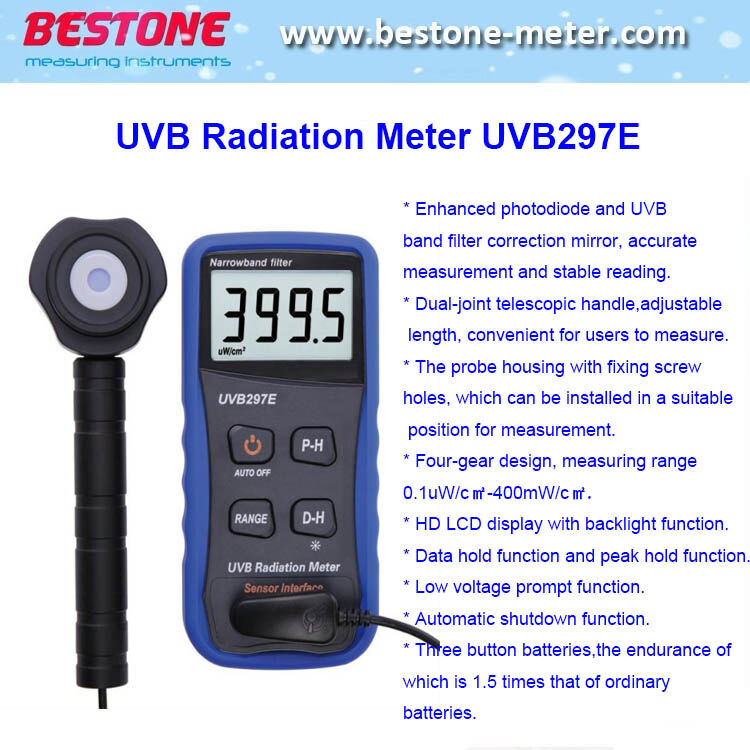 UVB297E UV radiation meter is specialized in detecting the intensity of UVB ultraviolet radiation emitte ed by the sun or lamps. The measurable wavelength range is275nm-325 nm, and the center wavelength is 297nm. The low-power digital chip is us ed in the detector, and the detector has stable performance and strong applicability after strict spectral and angular characteristics correcti on. The whole body is designed in a split type, so it is easy to carry. Built-in button battery with strong endurance.External probe with two telescopic handles, freely adjustable length and convenie nt measurement.